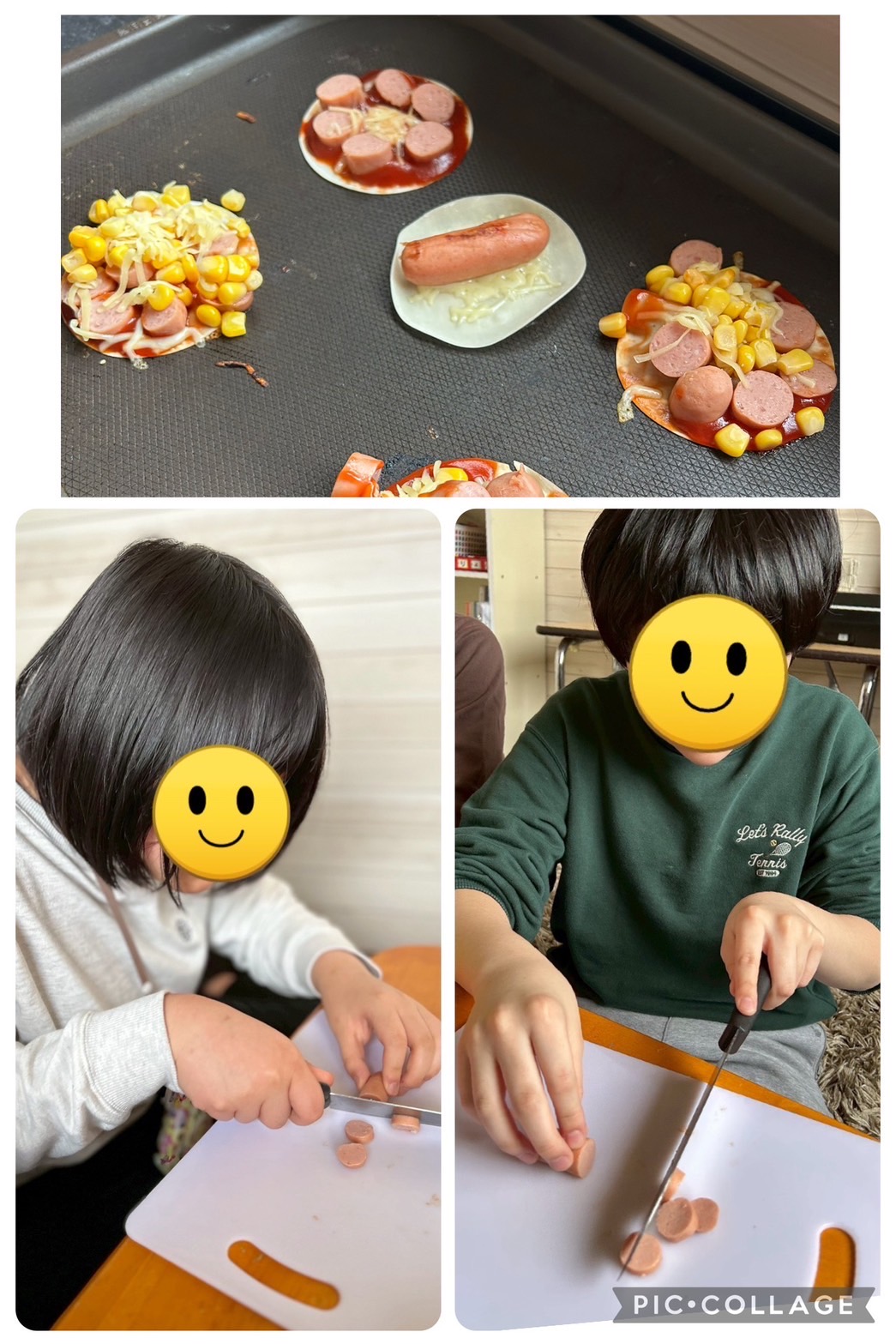 生地は餃子の皮を利用し、ウインナーやチーズ、コーンをトッピングしました。
