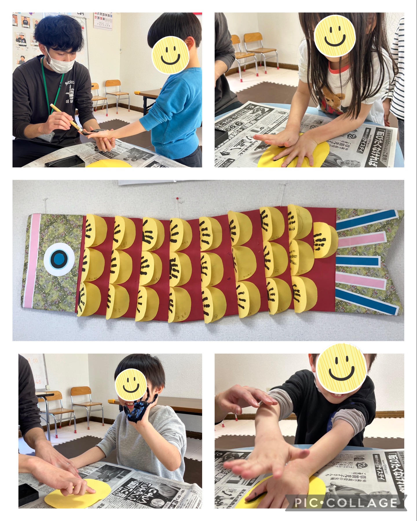 放デイさん達のこいのぼりは、墨汁で手形をつけてうろこに見立てました。